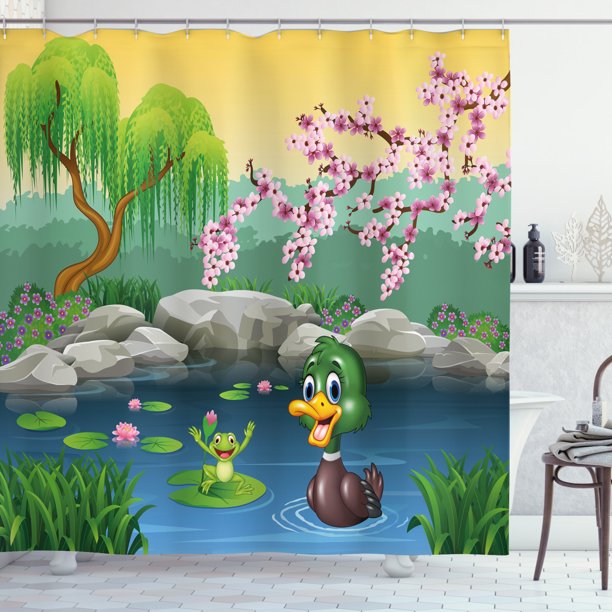 Cartoon Shower Curtain Vector Cute Ducks Frogs In A Lake Pond Trees Image Kids Nursery Design Artwork Fabric Bathroom Set With Hooks 69w X 70l Inches Multicolor By Ambesonne Walmart Com
